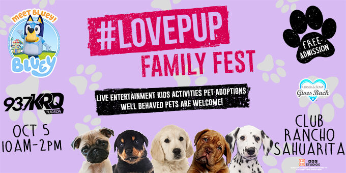 Join 93.7 KRQ, Johnjay & Rich, and the #LovePup Foundation at the Rancho Sahuarita Clubhouse on Saturday, October 5th from 10am - 2pm for the return of the #LovePup Family Fest, presented by Lerner & Rowe!