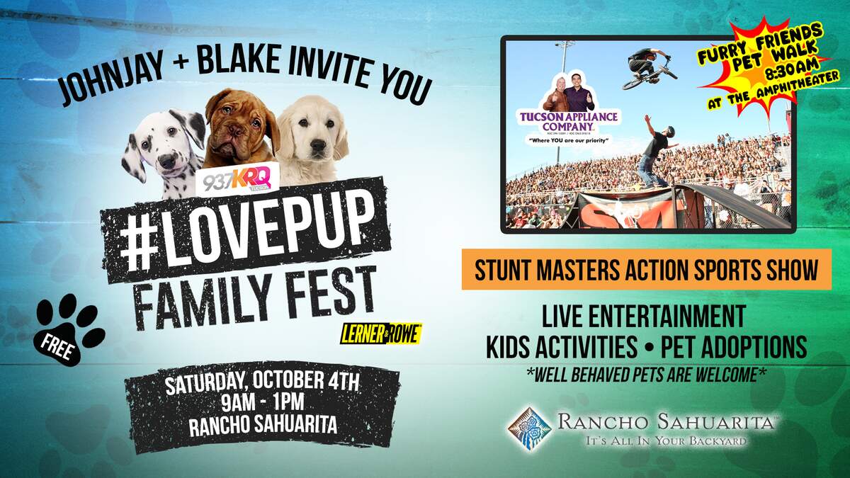 Join 93.7 KRQ, Johnjay & Rich, and the #LovePup Foundation at Rancho Sahuarita on Saturday, October 4th from 9am - 1pm for the return of the #LovePup Family Fest, presented by Lerner & Rowe!